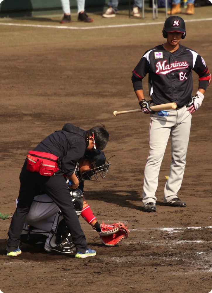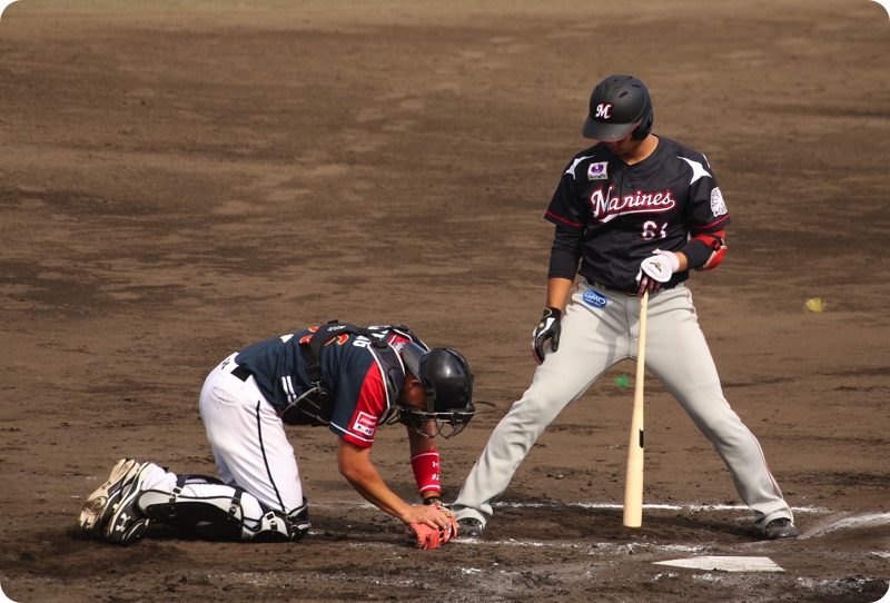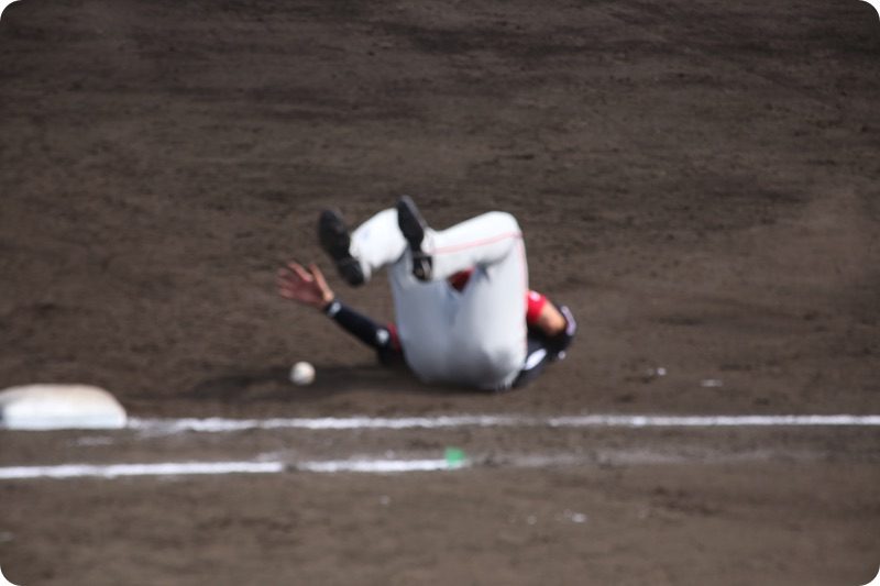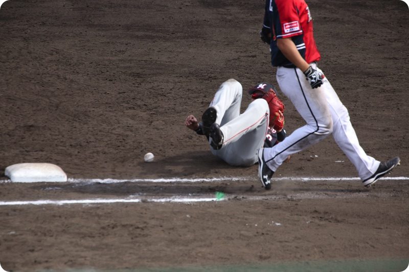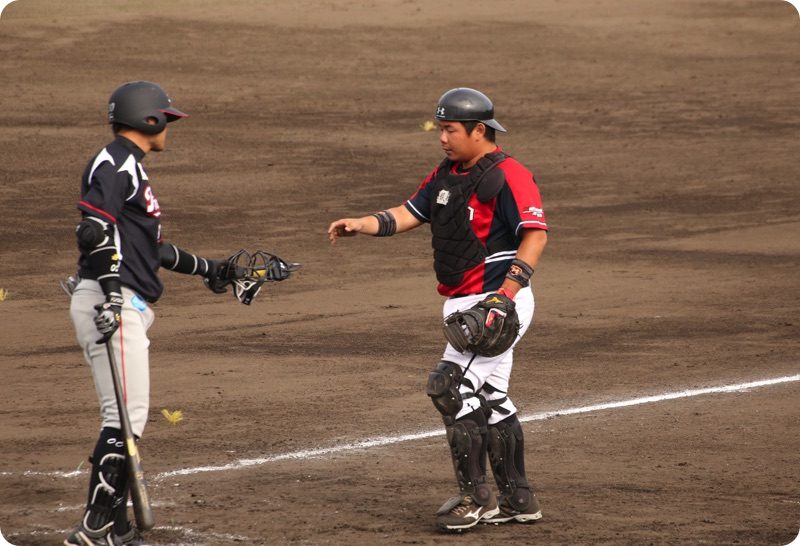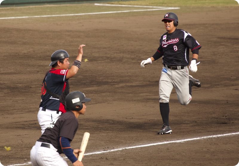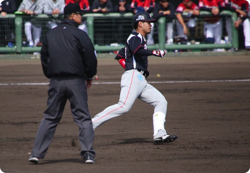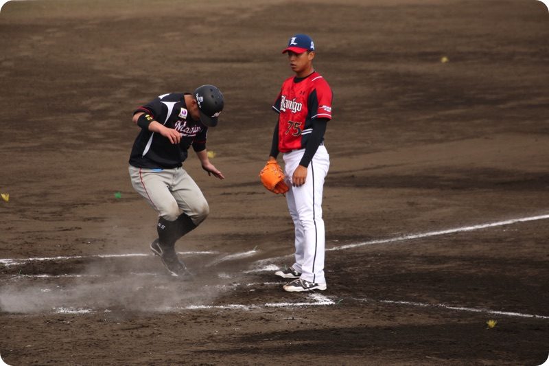 ワイルドピッチで2塁からホームまで戻って来ました。
