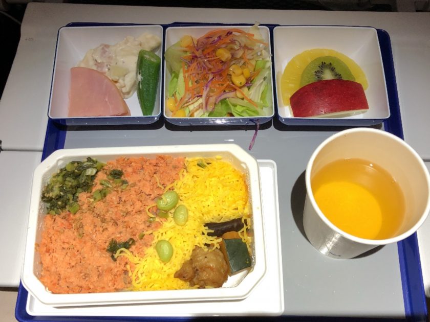 通路を左右にはさんだ3席を独占できたので助かった。横になって寝ることができた。しかし結局一睡もできず、4時40分に起こされた。朝食だと。迷わず日本食をチョイス。ちなみにANAの国際線だが、日本語通じるしキメの細かい対応でほんとうれしい。ありがたい。