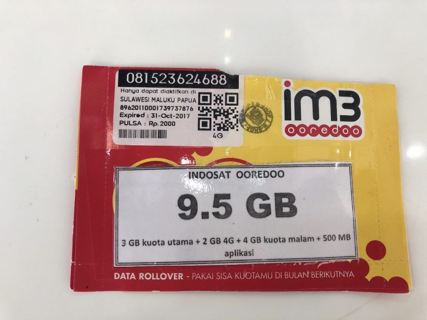 9.5GBで50,000ルピア(単純に100で割って500円)くらいだった。日本で調べたら500MBで3,850円とかだったのであほらしいね。