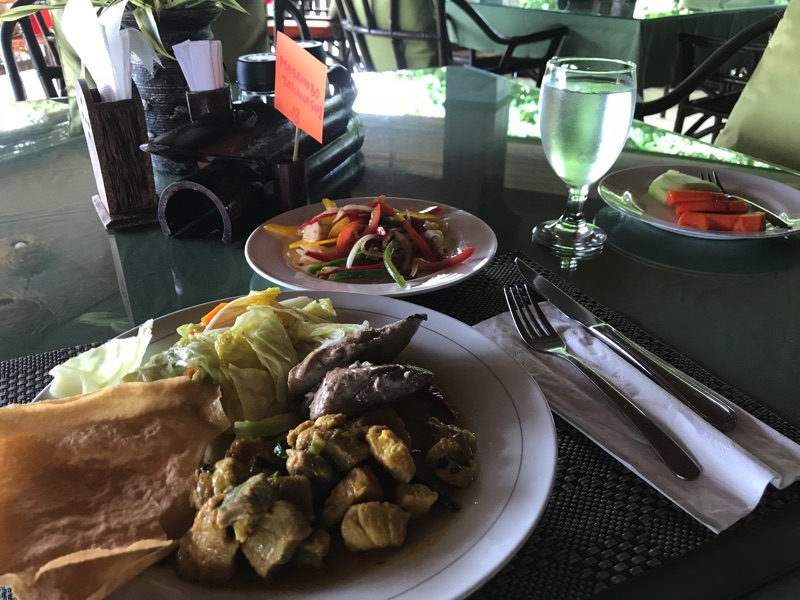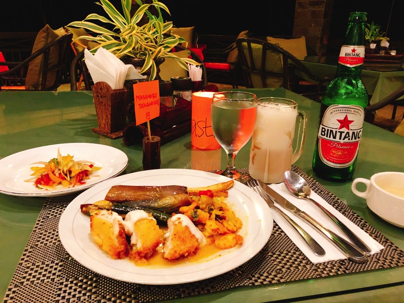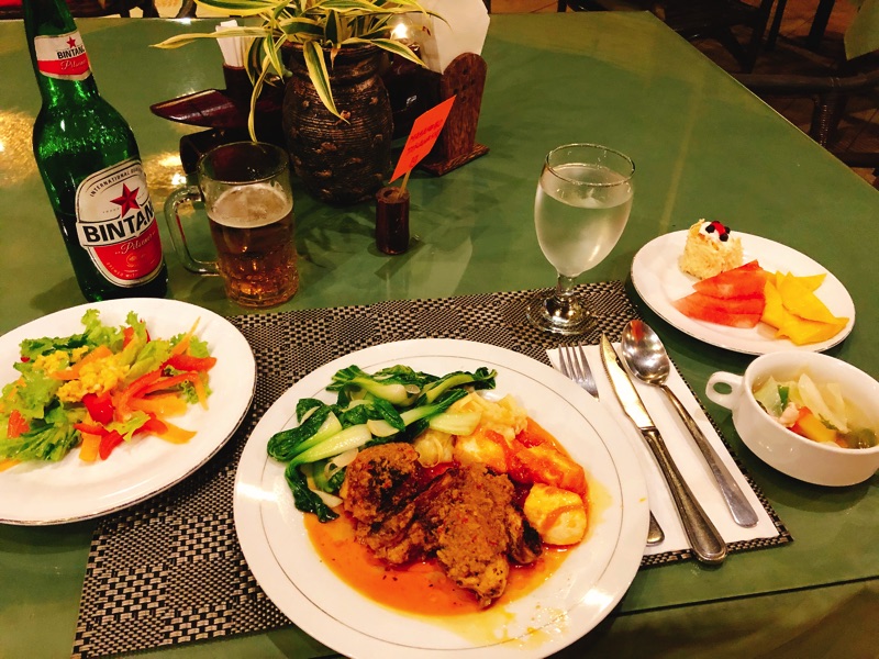 自分は今回ライス抜きで一切盛らなかった。糖質ダイエット(笑) サラダは多めに食べていた。 おかげで今回の旅行で太らずに済んだ。夜はいつもビンタンビール1本(50,000ルピア)つけた。