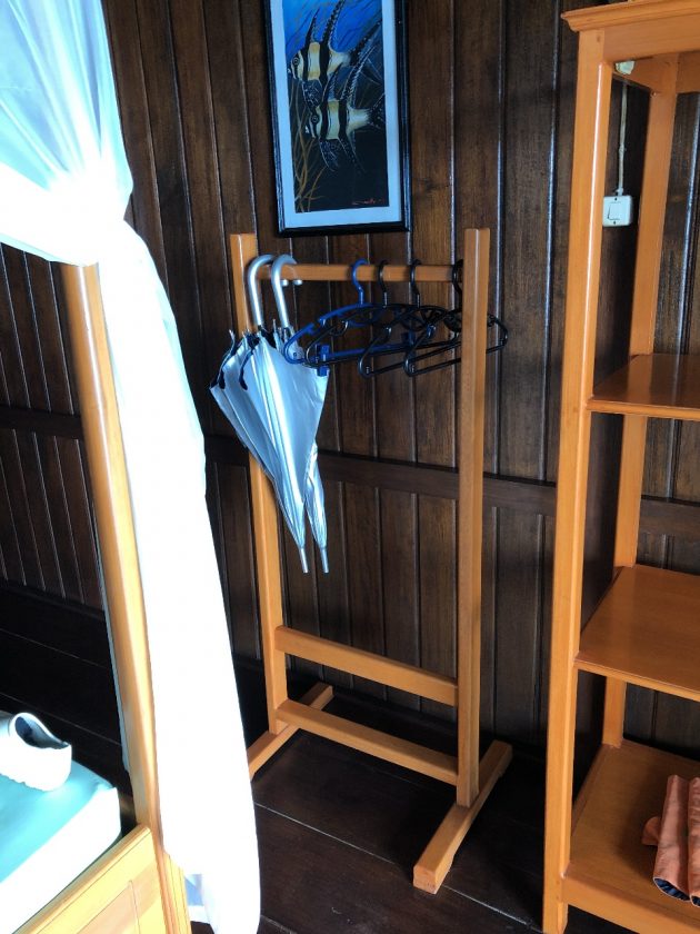 洋服掛け。にわか雨もよく降るので傘の準備もある。