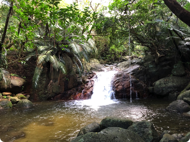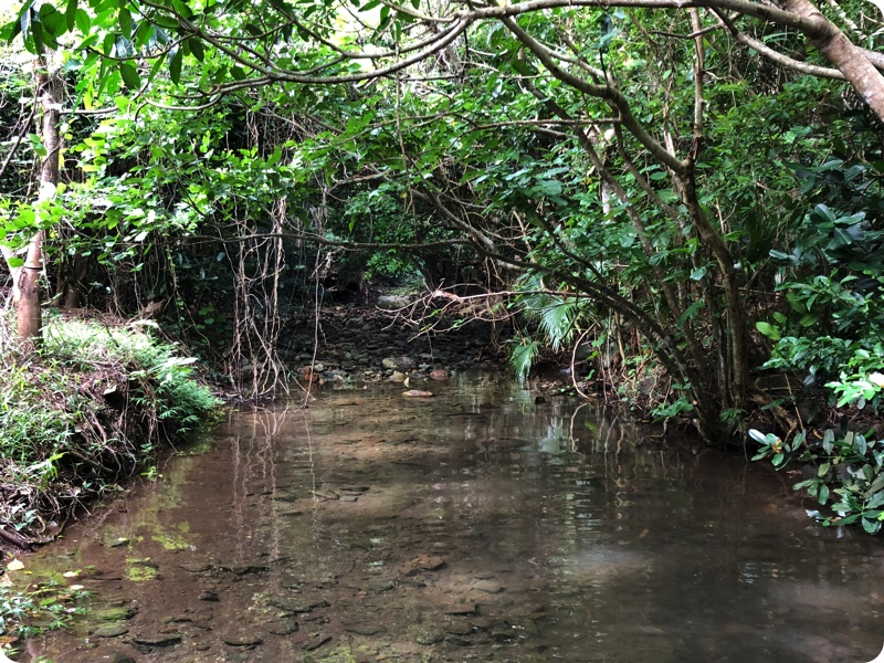 清らかな水場に行くと、イノシシの子どもが横切りました! まさにジャングル。