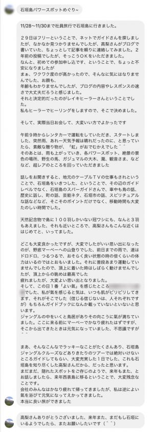 私はパワーを特別に感じたりするわけではありませんが(以前はかなり実感していて、人のオーラが見えた時もあったが、使っていないのでさびてしまった感あり)、今までパワーがある方(数人)から聞いた情報を織り交ぜて石垣島のパワースポットを案内させていただきました。