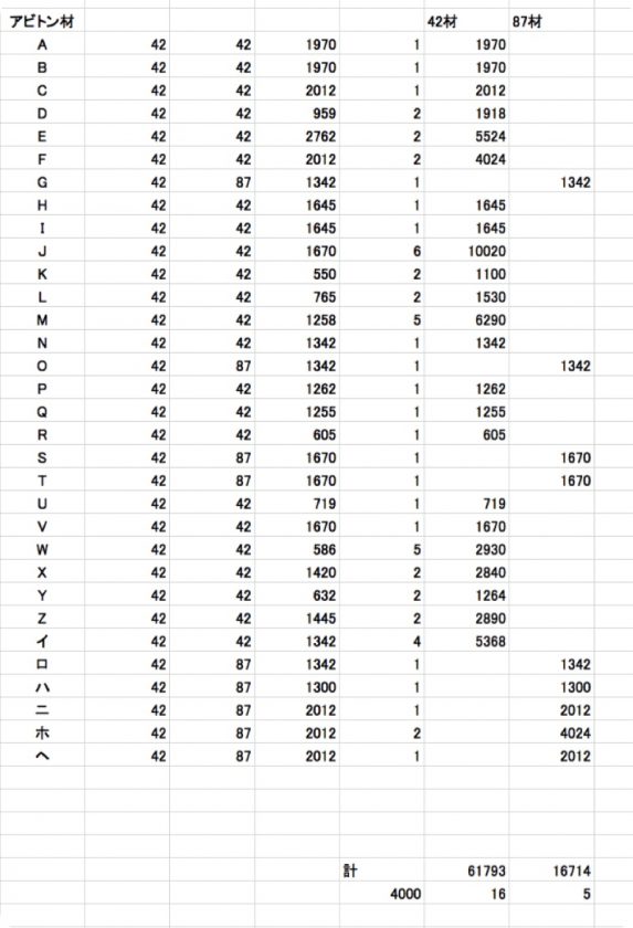 杉材が45×45なので、アピトン材も同じサイズかと思ったら、42×42と42×87が標準だという。