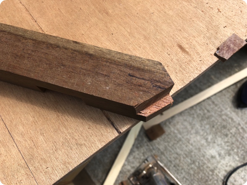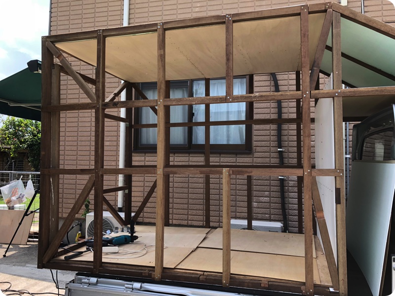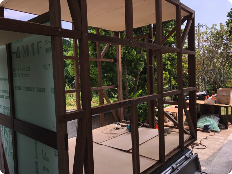 あとはあまったアピトン材で筋交いを入れました。ところどころに木材の半分の切れ目がありますが、ご愛敬です。