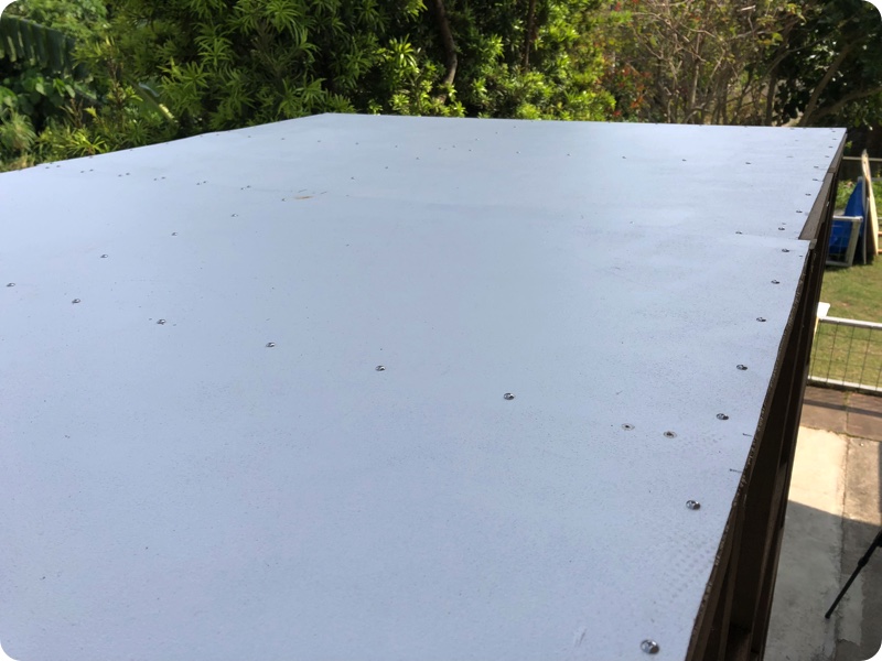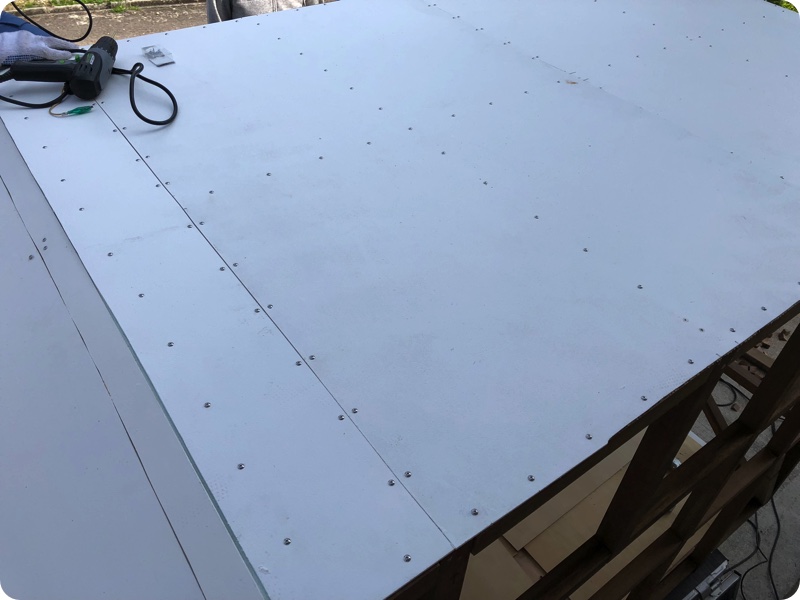 これは天井完成例。およそ10cmおきにネジどめ。後日この上からガルバニウム板(0.27mm)を張ります。