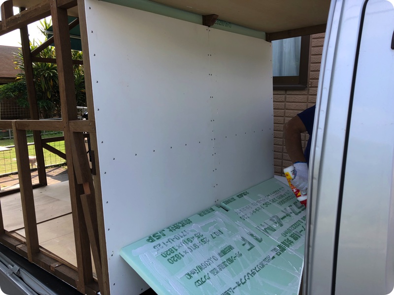 座席の後ろの処理と上部の処理。これが難しい斜めなのでネジ打ちも難しい。それでも完全に断熱材は張ります。かなりのこだわり。