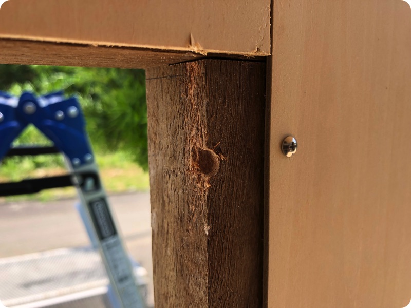 ベニヤ板を2枚貼り付けしのぎました。まだこの三角の内側をどのようにしようか迷っています。