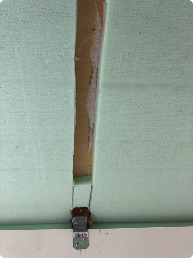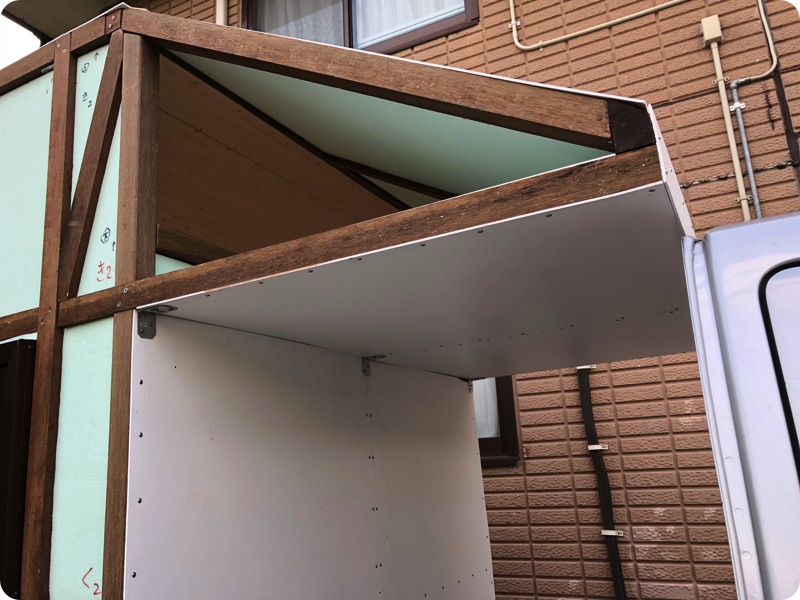 運転席のすぐ上の面。やはりこちらも真ん中に柱がないと支えられないので断熱材を外して柱を取り付け。