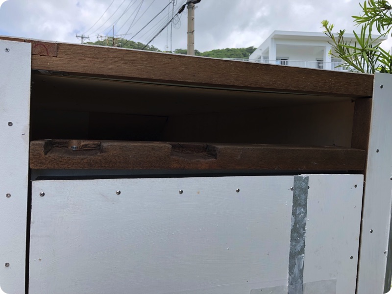 さて、換気扇部分の続き。こちらに被せるベニヤ板が乾いたので埋める作業。詳しくは動画で。