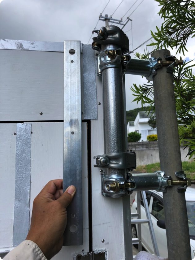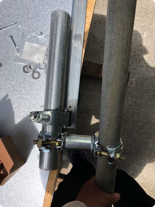 そしてこの縦長の金具もあわせて設置。この長さが450mmもあるで、先日375mmで切断した単管パイプは使えなくなった。