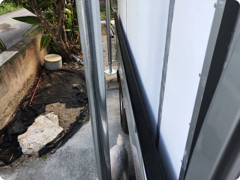 本当は本体とこのアオリの間に単管を置いて移動できるかと思っていたが、せまいためそれは不可能のようだ。計算ミス。