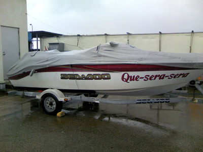スコール程度で終わるかな? と思い、ボードを港までもっていくも、なかなか雨はやまず。
