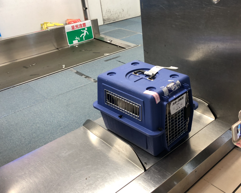 石垣空港でのチェックインは13:47。みるくとララを1つのゲージに入れました。