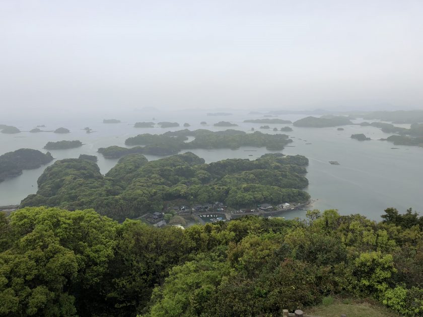 この眺め。雨だったので視界が悪し。晴れたらもっとすごいはず。九十九島だっけかな?