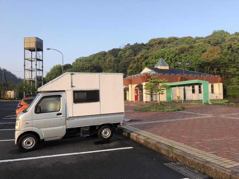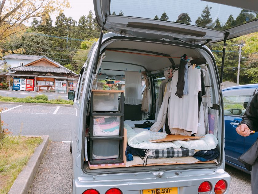 今日は道の駅でおじさん(自分より)3人から話しかけられた。こちらの方は静岡から。軽バンで九州を回っているらしい。これならばエアコンつけたままで大丈夫なのでいいね。横のつっぱり棒アイデア、いただきます。