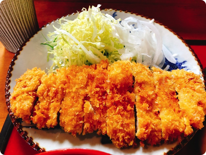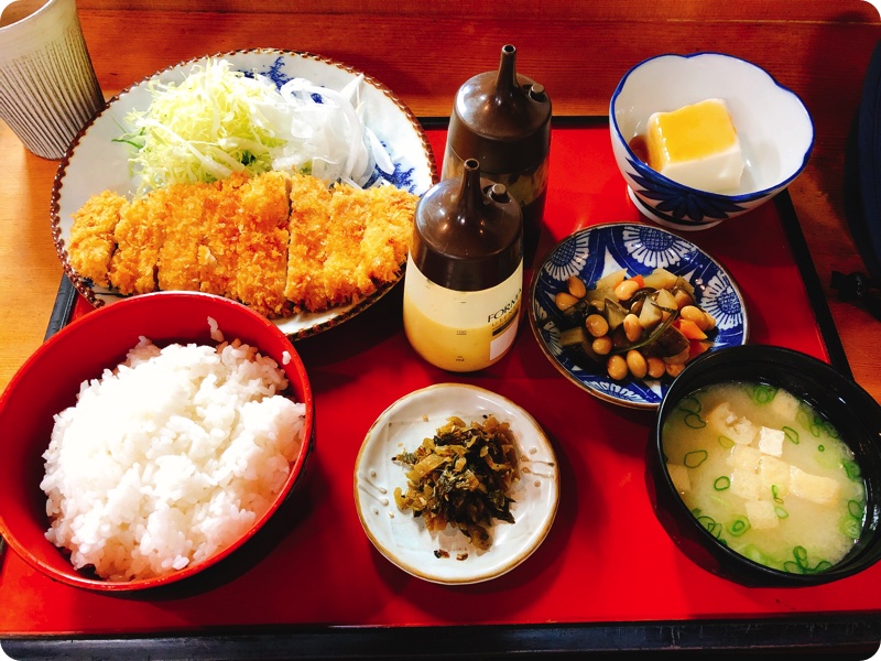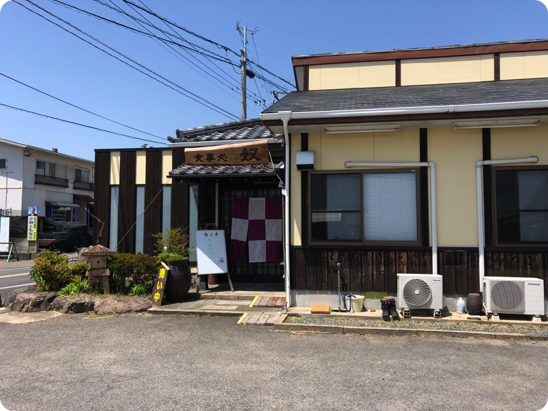 「お昼ご飯をどうしようかな」と考えながら走っていたら「ランチ500円」の看板が目に飛び込み、左に急ハンドル。「食事処 奴」に飛び込みました。なんと今日はトンカツのようです。「いつのよ」マークですね。