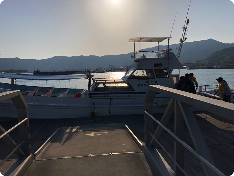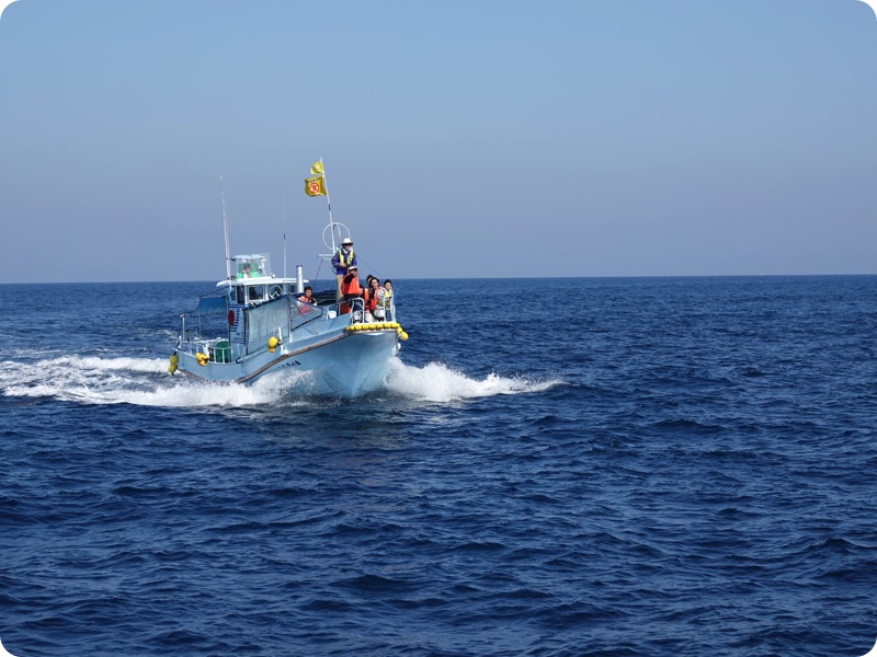 こんな船で行きました。暑い日でも長袖、できればカッパのような素材をはおるのがよいでしょう。海風をずっと受けているとかなり寒くなります。