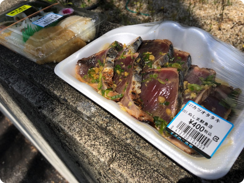 徳島の道の駅でカツオのタタキ買って昼飯にしました。相変わらず、場所がずれています。