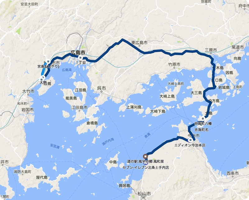 しまなみ海道を使って広島に渡ることにする。今治から渡ってきた道。すごく長かった。