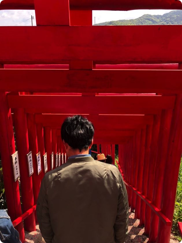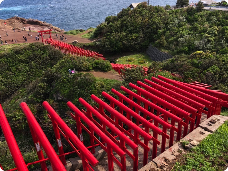 そして次は元乃隅稲成神社(もとのすみいなりじんじゃ)。賽銭箱が鳥居の上あり、みんな投げますが、なかなか入りません。「日本一賽銭が集まらない神社」と勝手に認定します。