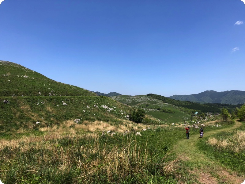 秋吉台のカルスト台地というところです。小学校の時に社会の授業で学んだと思います。写真一枚しかありませんでしたが、この場所にきてこの壮大なカルスト地形を目にすることができました。