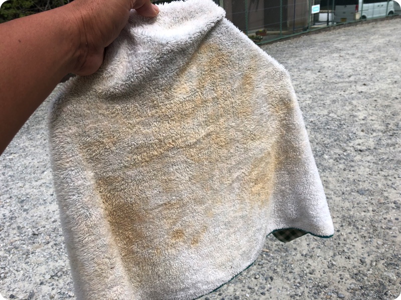 まるで赤さびの中に身を沈める感じ。あつ湯(44度)と、ぬる湯(42度)があり、ぬる湯は人が多く入れず、誰もいないあつ湯に入った。最初はつらかったが、次第になれ、5分くらい入ることができた。体をふいたらこんな感じでタオルが汚れてしまった。洗濯で落ちるのだろうか。