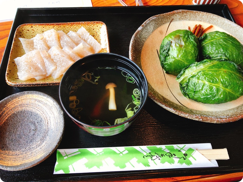 A目張り寿司と刺身こんにゃくを注文。寿司といってもオニギリのような者でした。お吸い物がおいしかった。