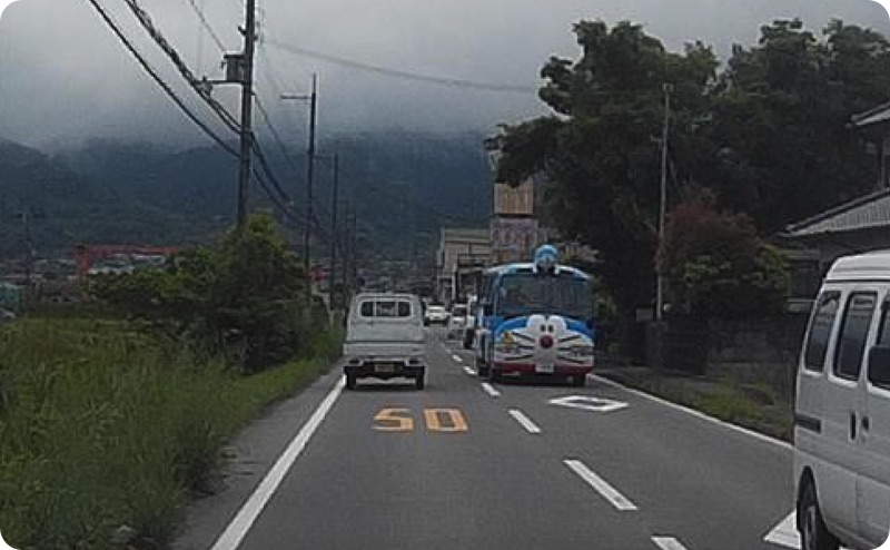 途中、こんな幼稚園のバスが走っていました。園児にとってはこのバスに乗るために入園する動機付けになるでしょう。