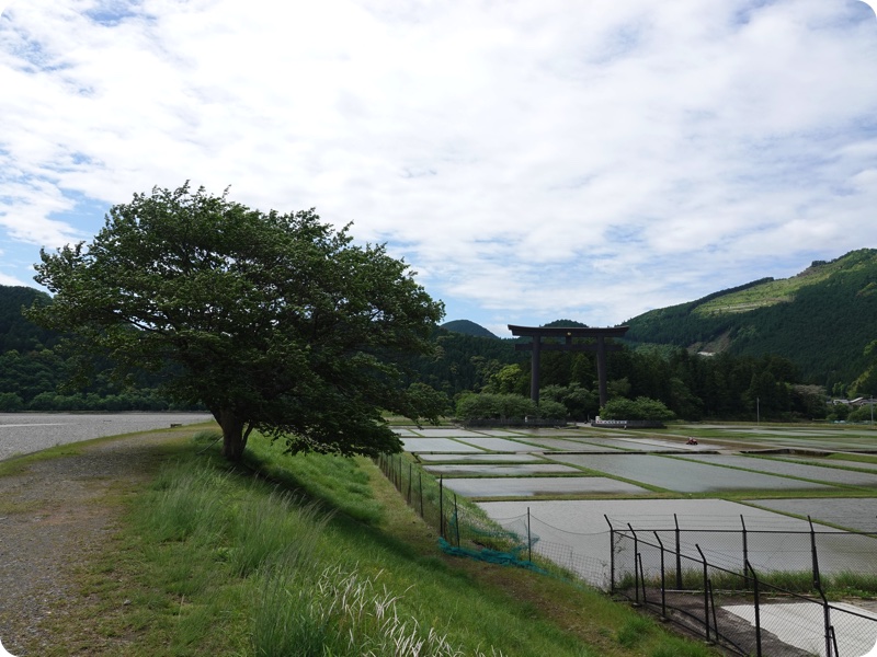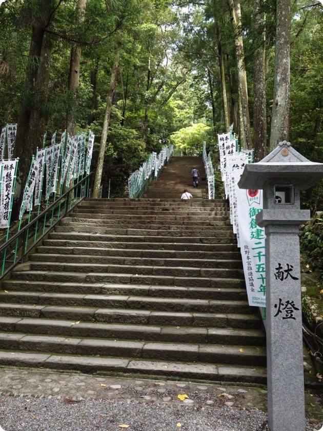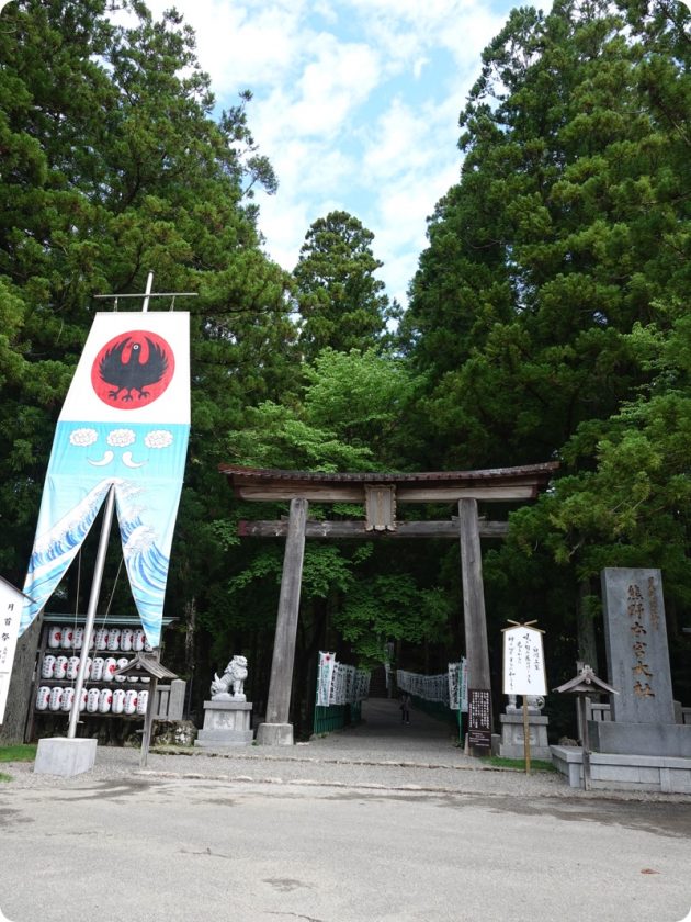 熊野本宮大社に到着。熊野古道のゴール地点とか。ちょっと写真は見えにくいが、日本最大の「日本第一大鳥居」(高さ約34m、幅約42m)だって。