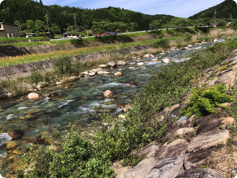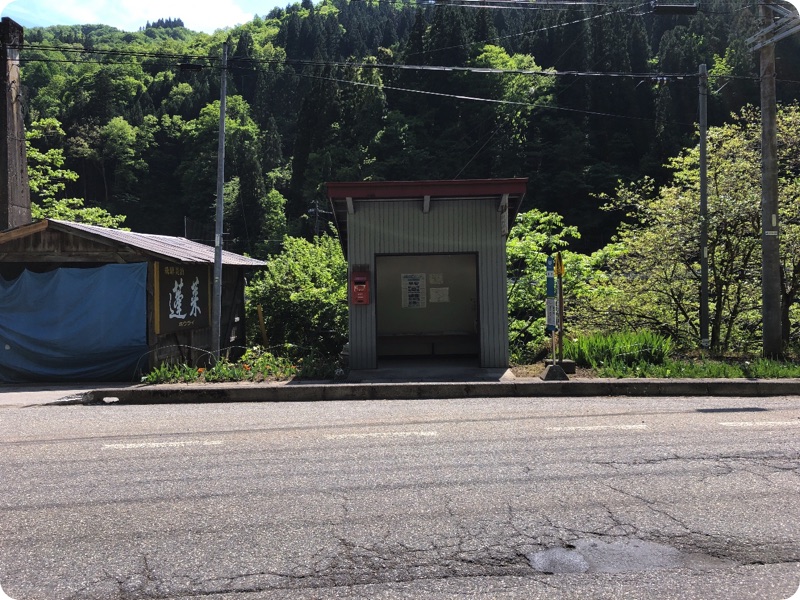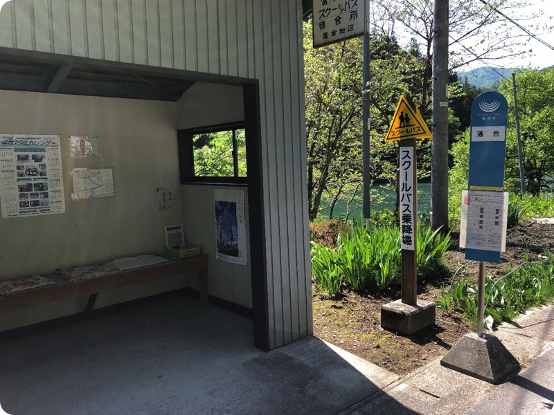 落合バス停。ここだけめっちゃ離れていて行くのが車でもいやになった。裏にはきれいな川が流れていた。