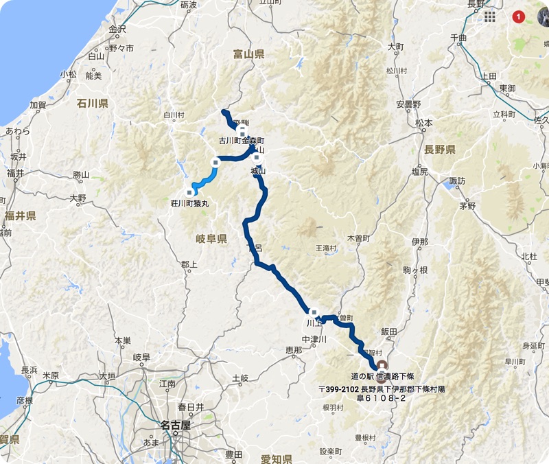 今日のルートはこんな感じ。301キロ。途中道を間違えた。白川郷への道は遠い。まぁ明日の朝に行けというお告げとしましょう。