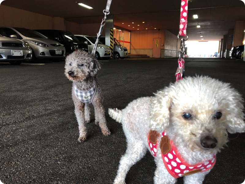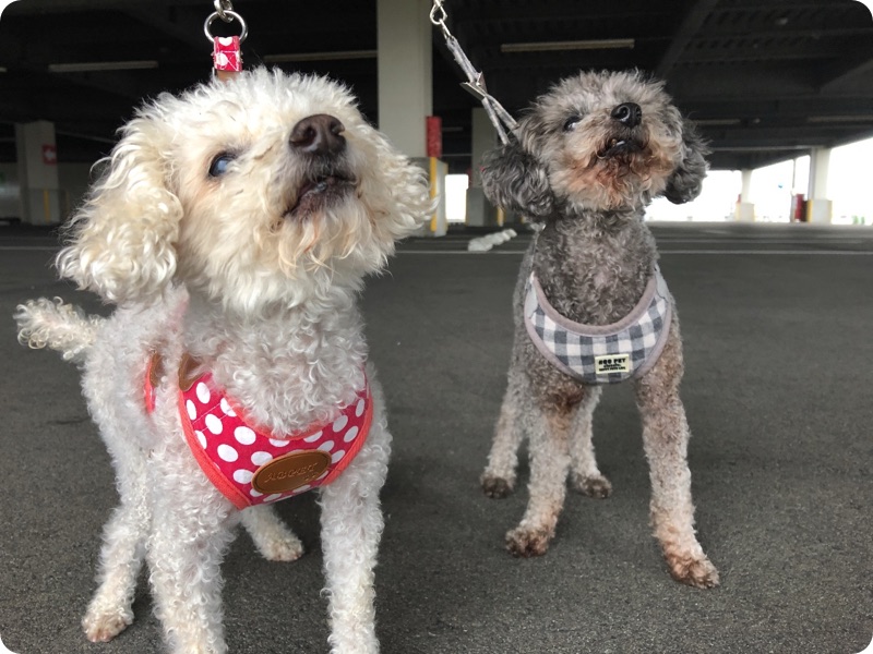 ヤマダ電機の駐車場で休憩。ようやくみるくとララを散歩できる場所にきた。