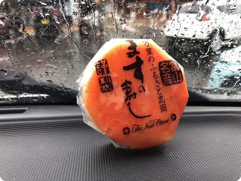 その後は高速の北陸道で2時間半くらい走りました。金沢の下道は悪路でへきえきしていましたが、さすがに高速は走りやすかったです。2車線なので好きなだけほかの車に抜いてもらい、平均時速60キロでひたすら走りました。途中のパーキングでこんなものがあったので食べて見ましたが、いまひとつかな。シャケのお寿司です。