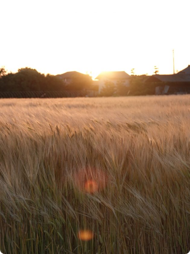夕日が沈む間際(たそがれどき?)に麦が黄金色になって揺れていました。