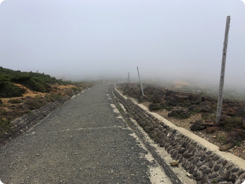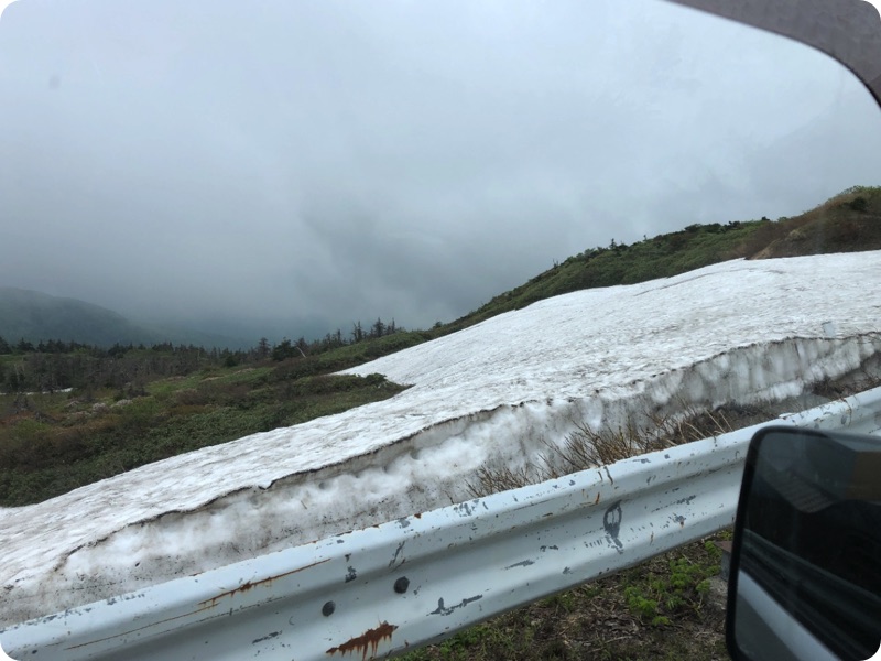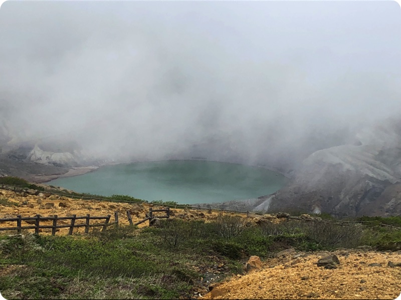 ぎりぎり、山頂の4キロ手前に料金所があり、「お釜をみたければ540円払いたまえ」ということで泣く泣く払いました。しかも「今日は霧がかかっていてお釜が見える保証はない」とも。