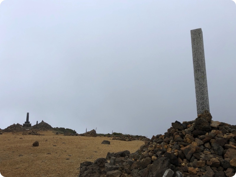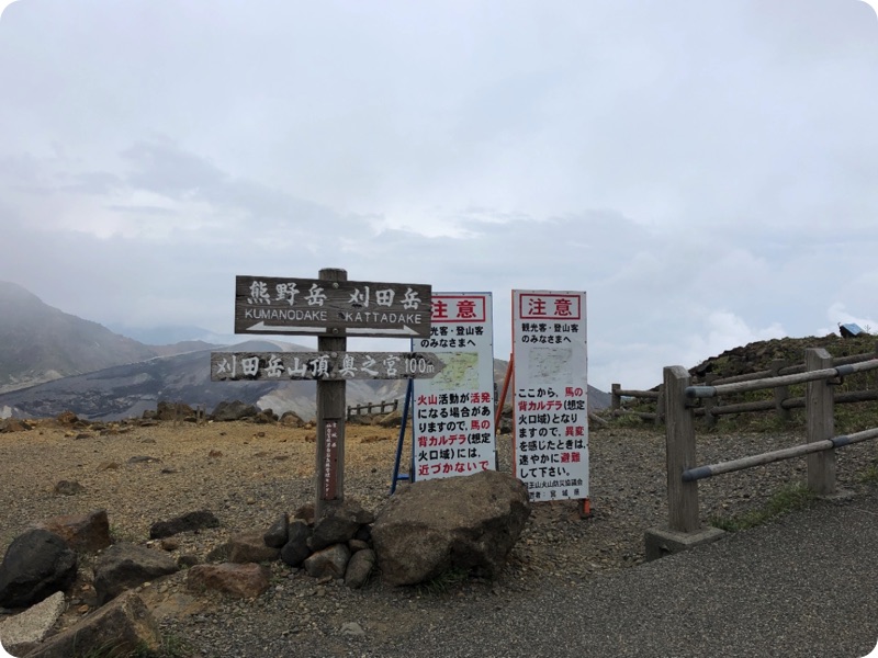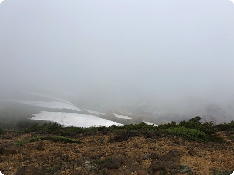 お釜、見えんやん。5分くらい待ちましたが、みるくとララもブルブル震えているため、降りることに。