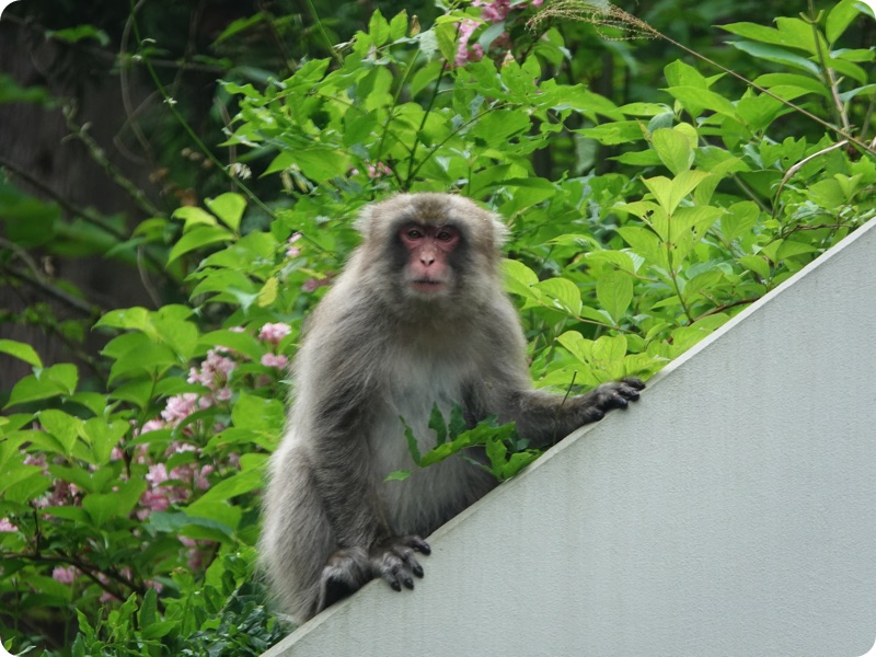 ちょうど道路に下校中の小学生がいたので、「あそこに猿がいるけどよくいるの?」と聞いたら、みんな猿の姿をみて、驚いていました。「お〜い、サル〜!」などと叫ぶ子どもも。