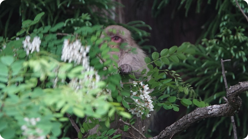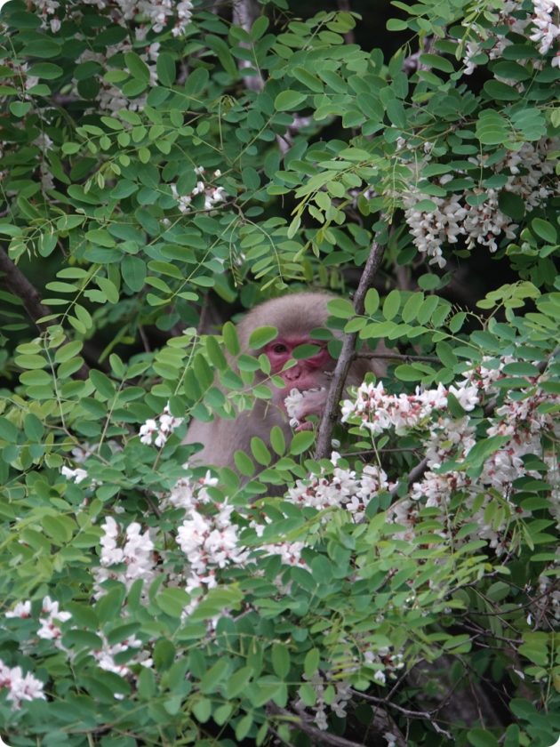 そしてそこから車でそれから数キロ進んだところ。道路を横断する1頭の猿の姿が。来た方向を見ると木が動いています。