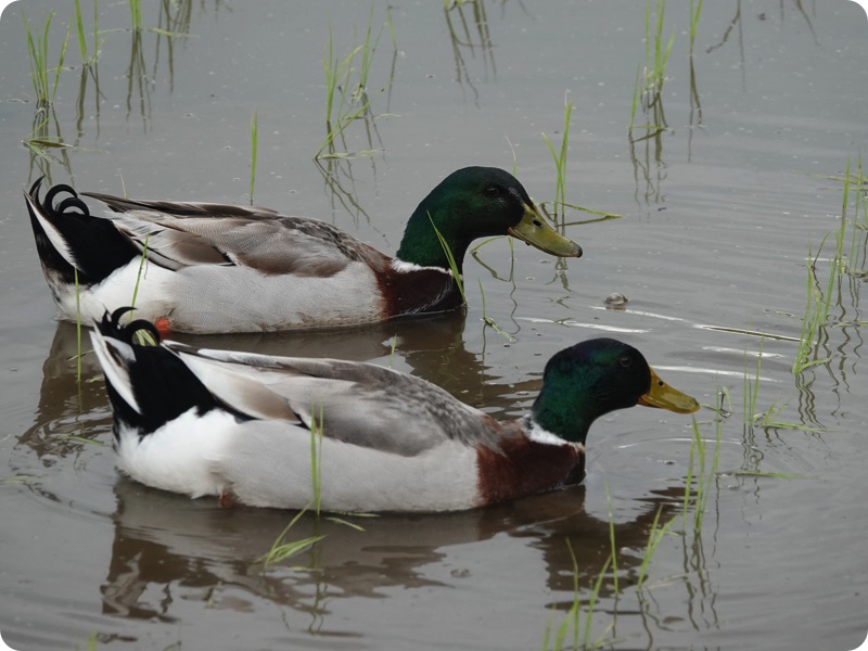 マガモのようです。警戒心薄く、3mくらいまで寄れました。ペアかと思いましたが、オスだけ、頭部が緑色になるそうです。