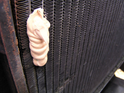 さて、車を走り終えてすぐにボンネットをあけてみると、ラジエターの液が噴射しているのを発見!!
