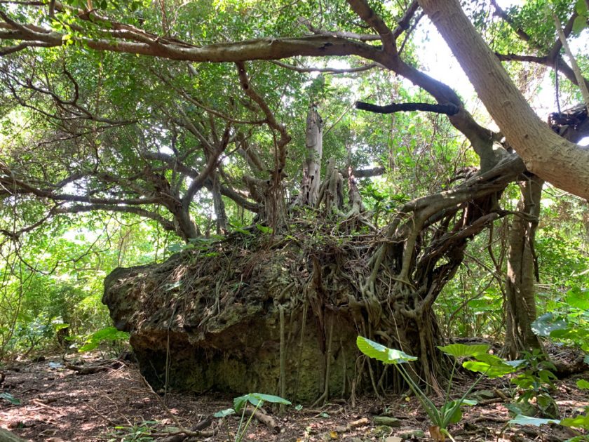 津波で打ち上げられたと思われる石の上は立派に木が。しっかりと根を土まで落としている。何年の時がたってこうなるのだろうか。