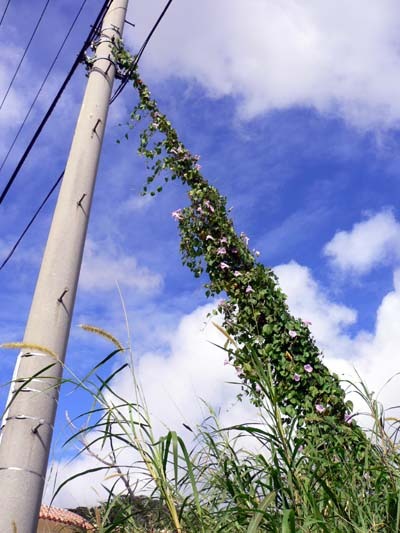アサガオの仲間? が電柱まで手を伸ばしていました。