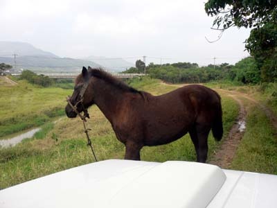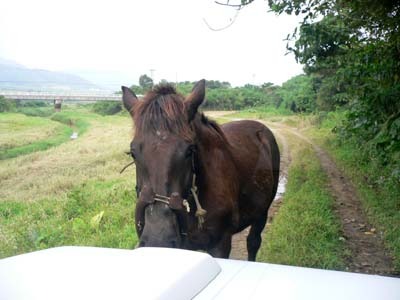 お気に入りの景色の場所を車で走らせると、馬が道で通せんぼ。