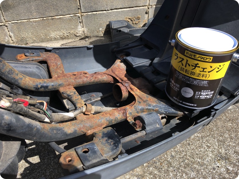 金ブラシでサビを取り除ける部分はサビを落とし、次に上から赤さびを黒さびに変えるとかいう塗料を塗る。